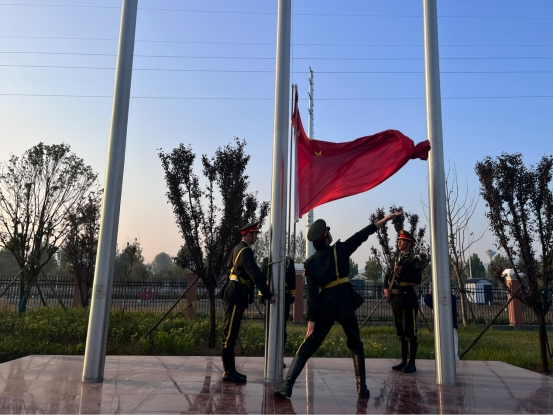 升旗仪式由张亚飞老师主持,7点10分升旗仪式正式开始,国旗护卫队步履铿锵,英姿飒爽,护送鲜艳的五星红旗进场。伴随着雄壮的《义勇军进行曲》五星红旗在朝阳中冉冉升起。