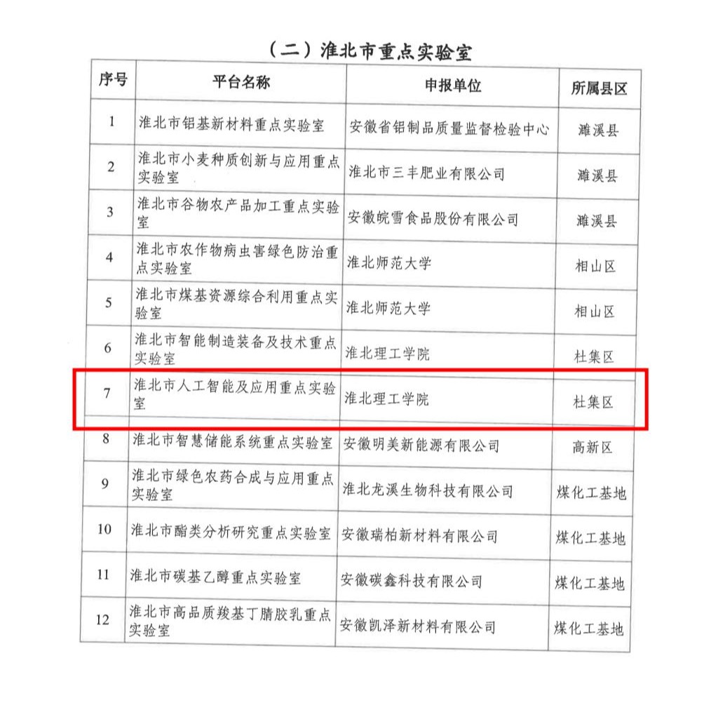 为进一步贯彻落实《关于加快推进科技创新平台建设的实施意见》(淮政办〔2023〕16号)精神,根据《关于印发<淮北市科技创新平台认定管理办法(试行)>和<淮北市科技创新平台绩效评价管理办法(试行)>的通知》(淮科〔2023〕16号)和《关于申报2024年度淮北市科技创新平台的通知》(淮科秘〔2024〕28号)文件精神,淮北市科技局经通知发布、组织申报、县区(园区)科技管理部门审核推荐、复核、专家评审、局党组会议研究同意、公示等程序,best365中国官方网站best365中国官方网站申报的“淮北市人工智能及应用重点实验室”,获批立项建设。