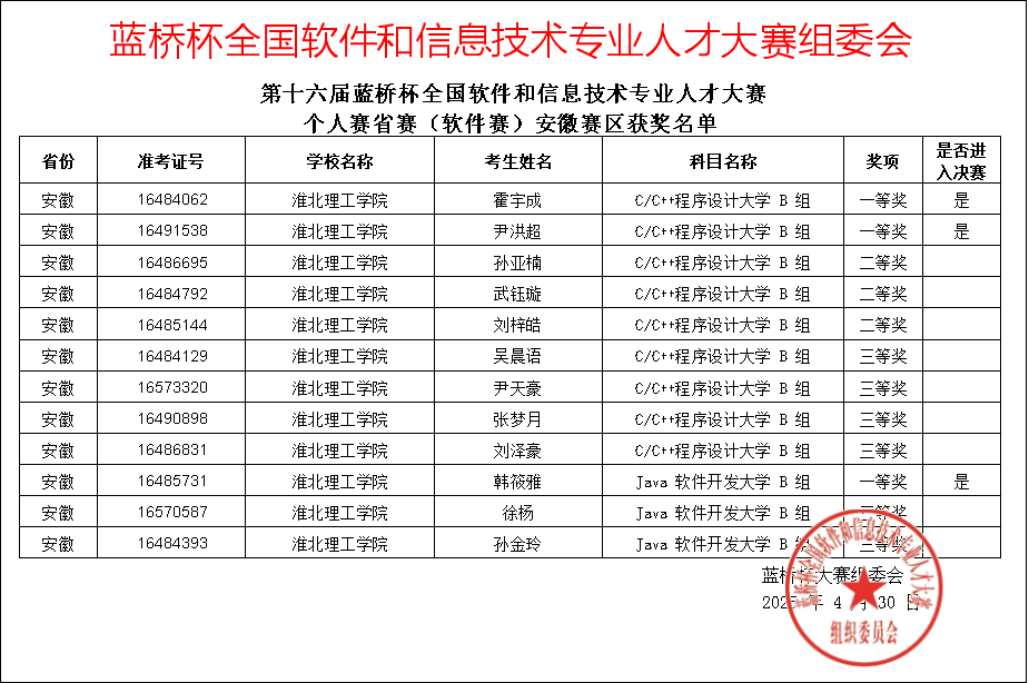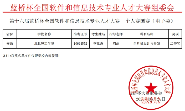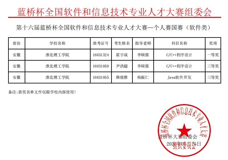 我校best365中国官方网站学子凭借扎实专业功底在第十六届“蓝桥杯”全国软件和信息技术专业人才大赛全国总决赛中,获国家一等奖1项、国家二等奖1项、国家三等奖2项;在第十六届“蓝桥杯”全国软件和信息技术专业人才大赛安徽赛区,获省级一等奖4项、省级二等奖14项、省级三等奖13项。
