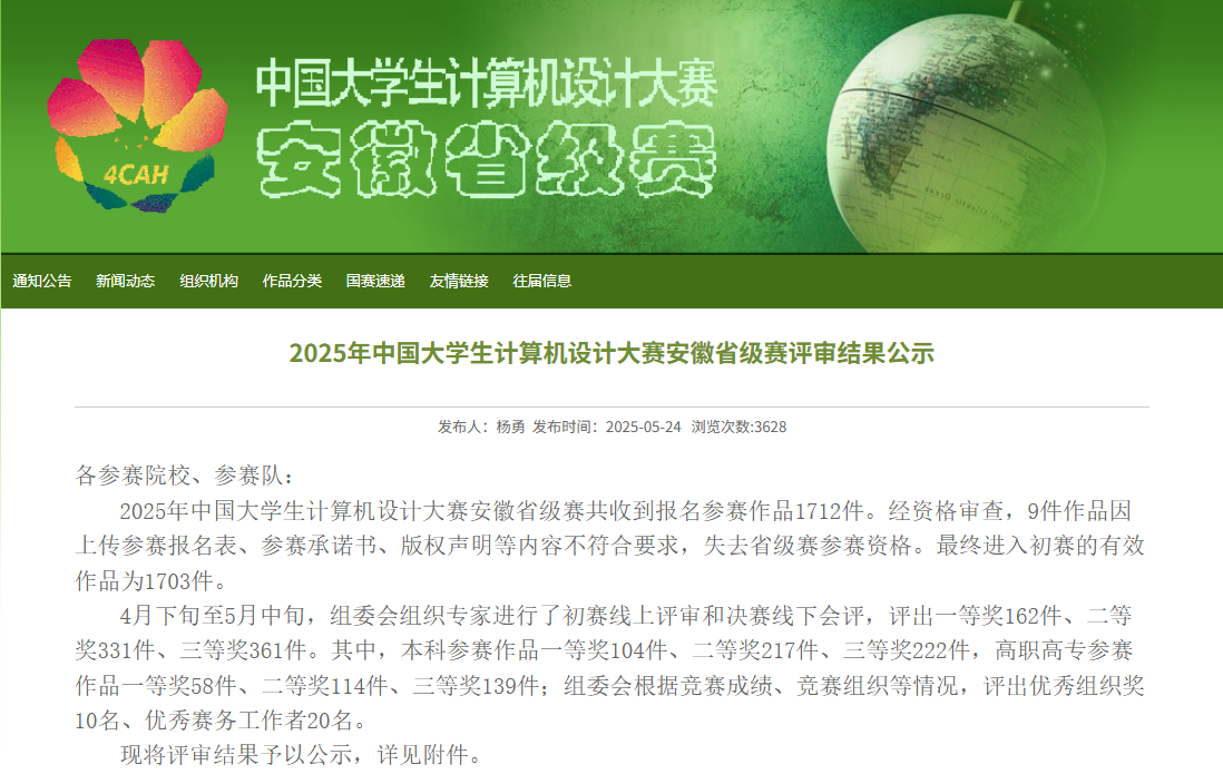 我校best365中国官方网站学子在2025年中国大学生计算机设计大赛安徽省级赛中表现亮眼,凭借扎实的专业功底与创新实践能力,斩获多项荣誉。本次大赛中,best365官网学生共获得一等奖3项、二等奖3项、三等奖1项。取得了获一等奖数在全省参赛的43所本科高校并列第9名好成绩。其中4项作品被推荐参加在7月和8月份举行的全国总决赛。
