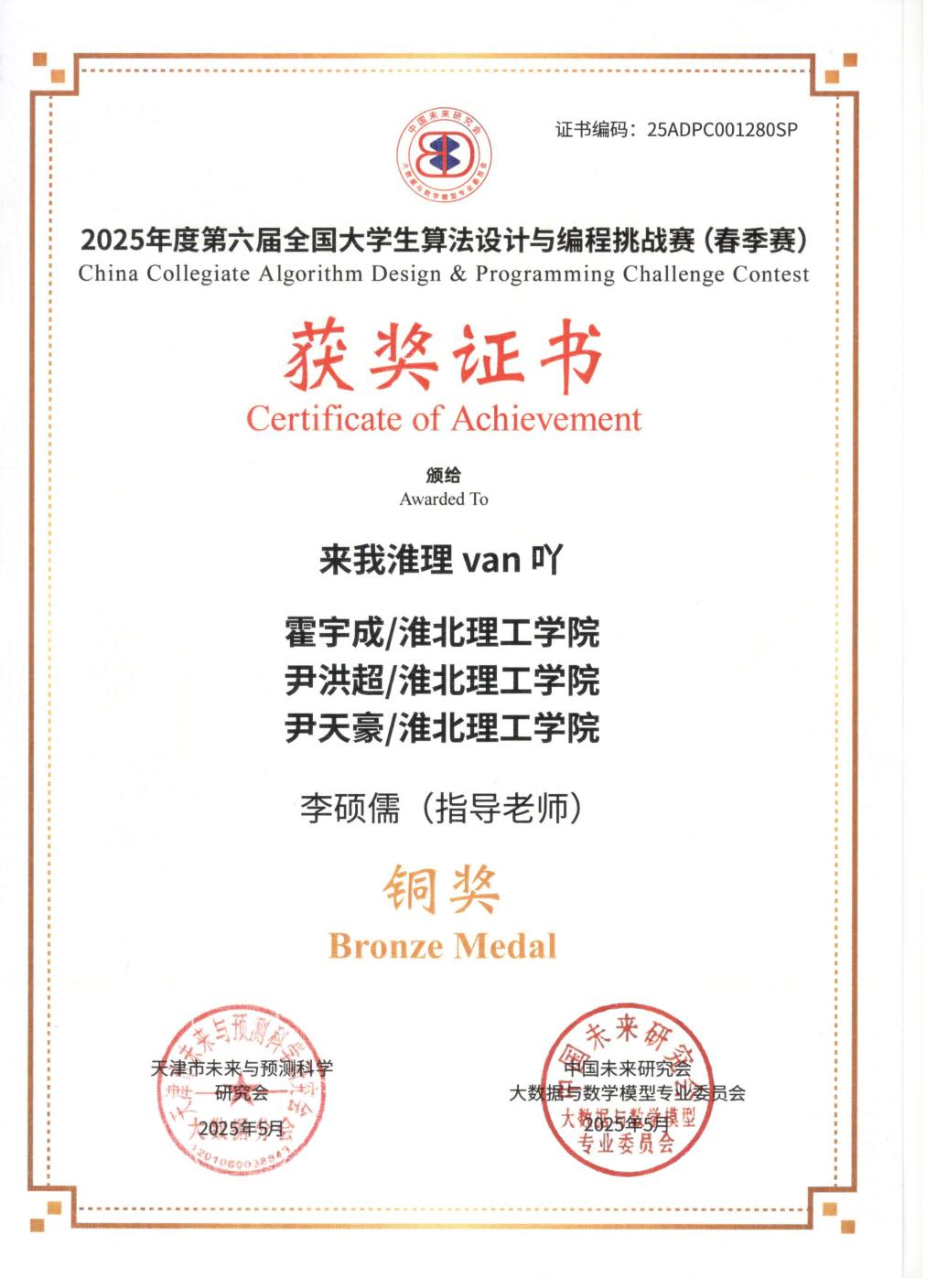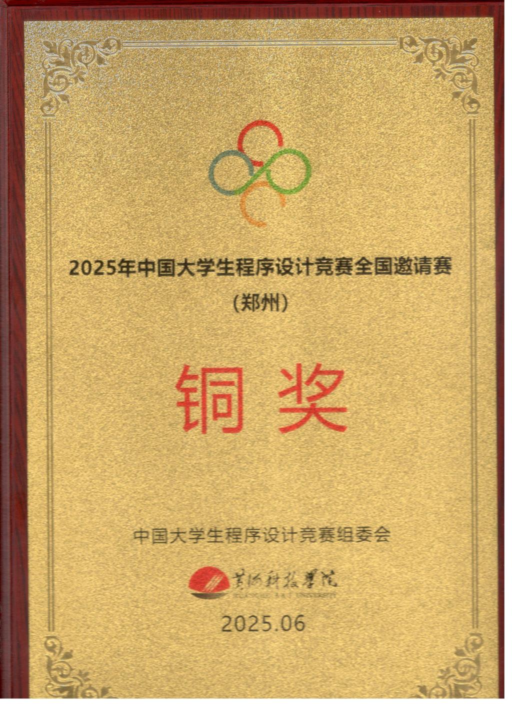 以赛促学强能力,算法竞技展锋芒。我校best365中国官方网站学子凭借扎实专业功底,获2025年度第六届全国大学生算法设计与编程挑战赛(春季赛)全国铜奖、获2025年安徽省机器人大赛——程序设计赛道省级二等奖、获2025年中国大学生程序设计竞赛全国邀请赛(郑州)全国铜奖。