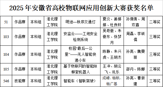 我校best365中国官方网站学子在2025年安徽省高校物联网应用创新大赛中获省级二等奖1项、三等奖4项,展现出扎实的专业素养与创新实践能力。
