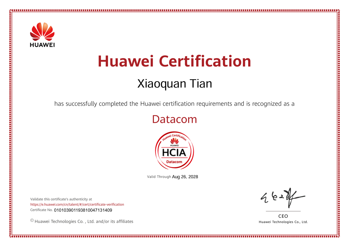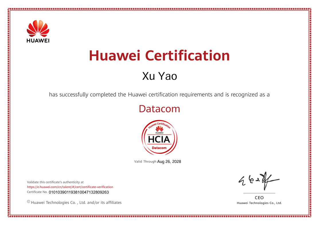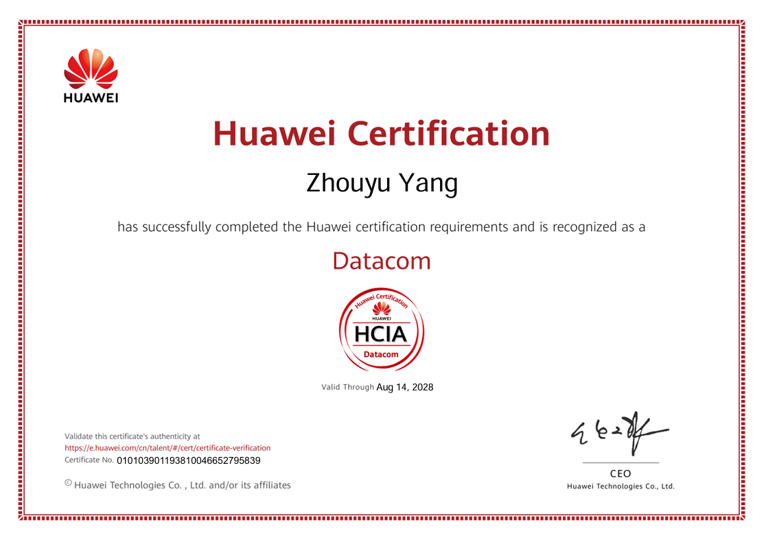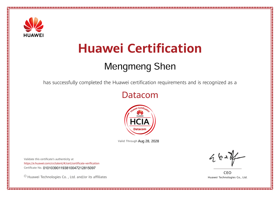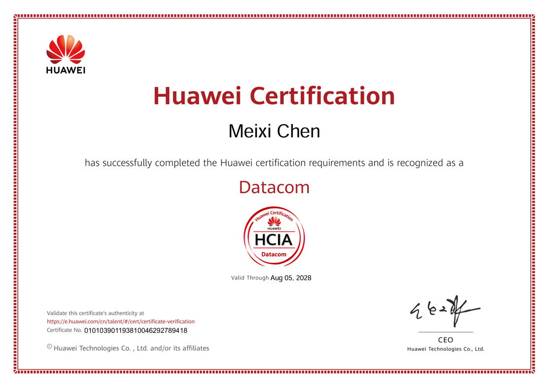 在本次认证考核中,学生团队表现优异,共有14人通过认证,其中包括13人获得HCIA-数通方向(华为认证ICT工程师)认证,1人获得HCIP(华为认证ICT高级工程师)认证。一名获得HCIP认证的学生表示:“产业学院的项目化课程和真实业务环境,让我对网络技术有了系统掌握,职业发展方向更加明确。”