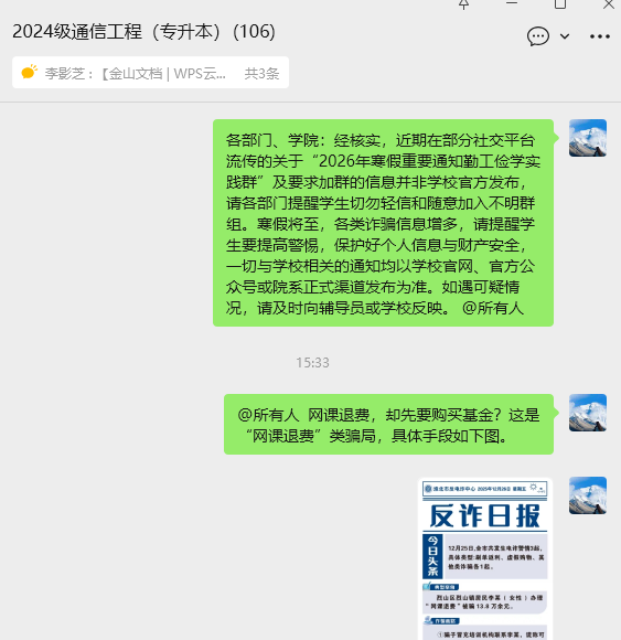 在进网络工作中,学院充分发挥新媒体平台的桥梁作用。辅导员通过班级微信群、QQ群等线上渠道,定期推送诚信考试倡议书、心理调适指南、反诈预警信息等内容,及时解答学生线上提出的复习备考、政策咨询等问题。同时,密切关注网络舆情动态,主动回应学生关切,营造清朗、健康的网络育人环境,实现“线上线下”联动育人,确保教育引导无死角。