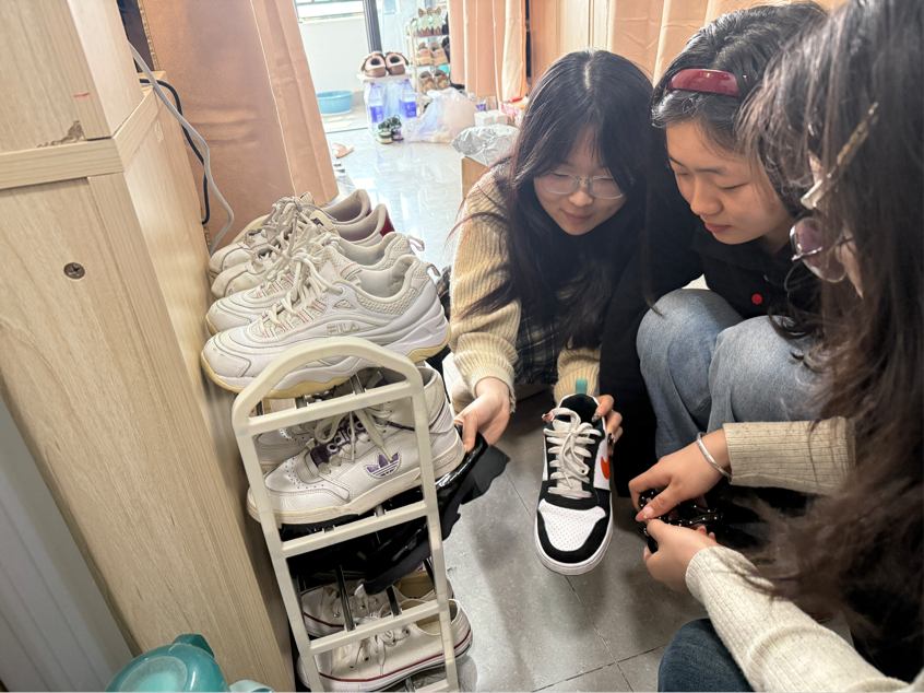 针对鞋类收纳难题,她分享了“立式鞋架+分类摆放”的方法,利用窄款多层鞋架将鞋子竖向陈列,按季节和使用频率划分区域,既节省了地面空间,又方便快速找到所需鞋子,有效解决了宿舍鞋多易乱的问题。