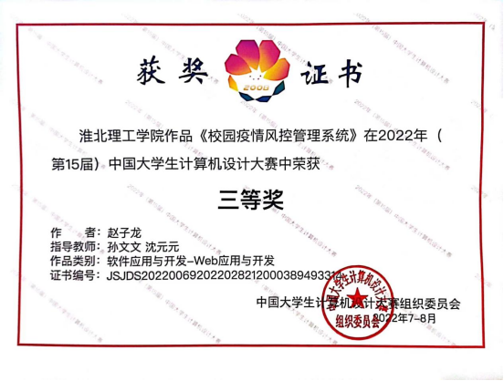 2022年(第15届)中国大学生计算机设计大赛全国总决赛线上答辩工作8月底圆满落下帷幕,我校参赛团队再创佳绩。经过严格的专家评审和激烈的网络答辩,best365中国官方网站best365中国官方网站赵子龙同学在软件开发大类中获得国家三等奖。