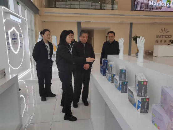 朱德顺首先考察了英科医疗用品有限公司,英科医疗人力资源部门经理邵素华从企业规模、产品种类、技术发展等方面做了详细介绍。
