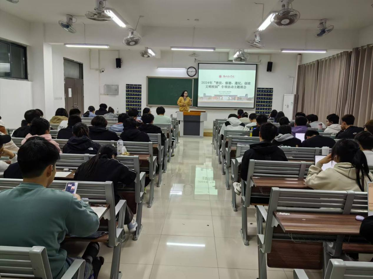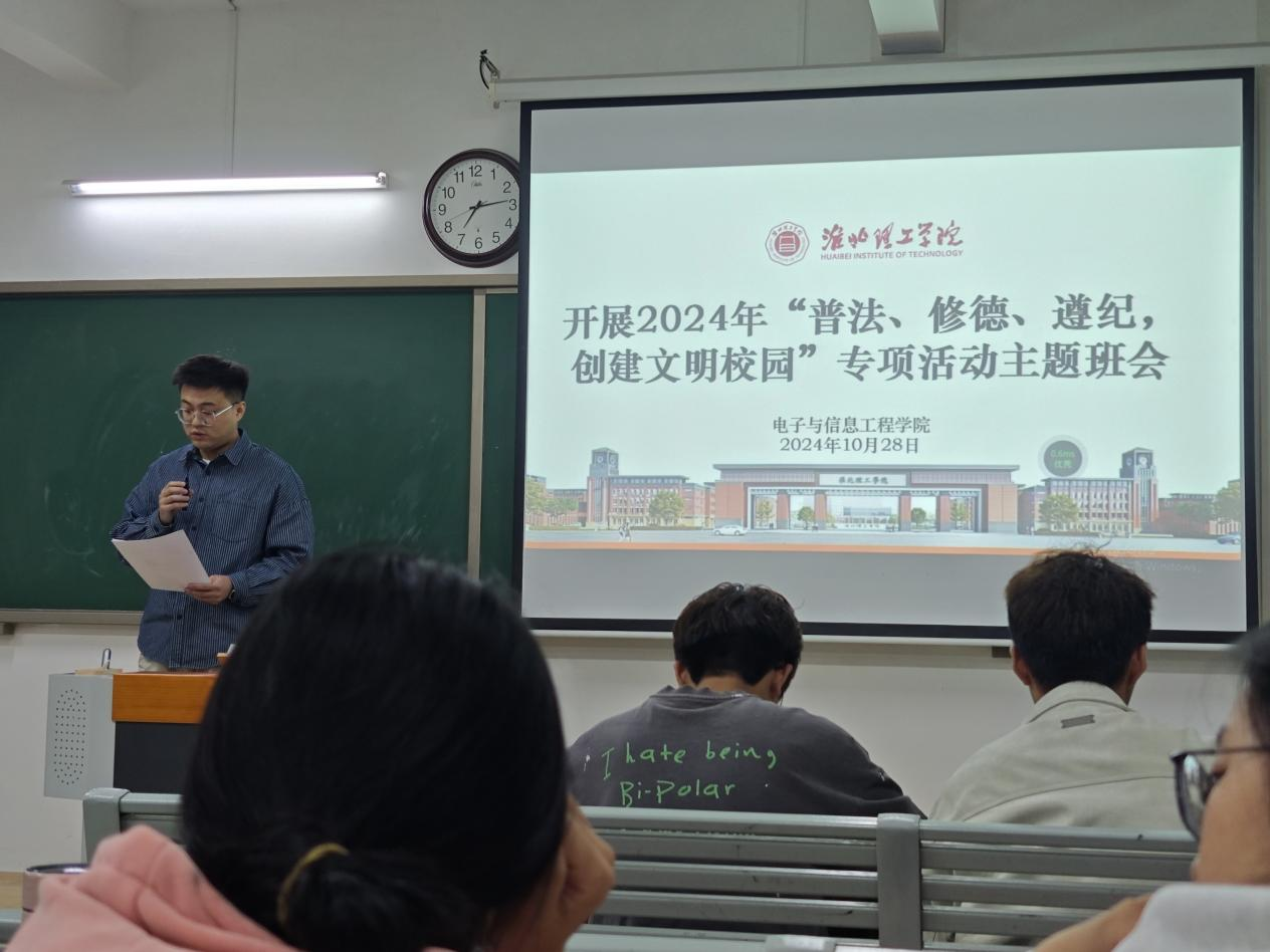 为贯彻落实立德树人的根本任务,坚持“依法治校,以德治校”。best365中国官方网站于2024年10月28日开展“普法、修德、遵纪,创建文明校园”的主题班会。此次主题班会旨在通过丰富多彩的宣传教育和实践活动,营造出一个法治、文明、和谐的校园环境。