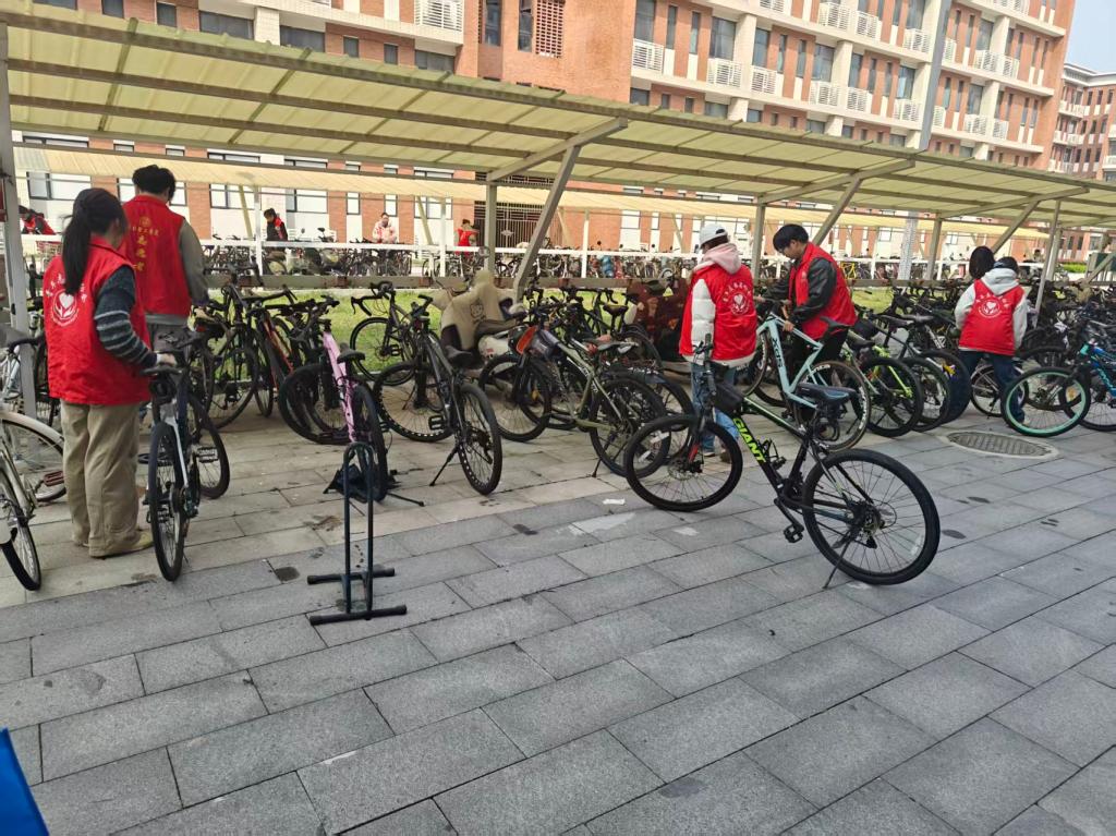 面对随意停放、歪斜倾倒的自行车与电动车,志愿者们分工协作、有条不紊,轻轻扶起倒地车辆,将超出停车线的车辆逐一归位,按照车型分类排列,细心调整车头朝向、对齐车尾、均匀间距,让原本杂乱的停车区域变得整齐划一。部分志愿者还拿出自带的抹布,擦拭车把、车身的灰尘,用点滴行动守护校园洁净。