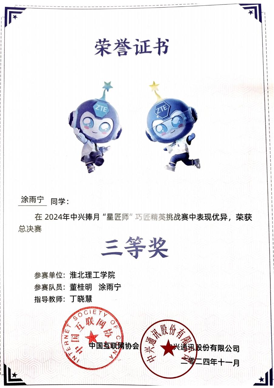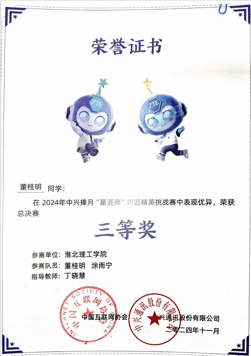 2024年10月27日,第十四届中兴捧月“星匠师”巧匠精英挑战赛全国总决赛在东南大学落下帷幕。本次大赛由中国互联网协会与中兴通讯主办、东南大学承办,旨在面向5G新基建培养具备扎实理论知识和实践能力的应用型人才。best365官网首次组织学生参赛,大赛实行“省级初赛+全国决赛”模式,best365官网4名学子组成2个团队与来自全国215所院校的627个团队参与角逐,最终2021级通信工程专业的董桂明、涂雨宁同学在省级比赛中顺利晋级,在全国决赛中荣获三等奖及1000元奖金的佳绩。